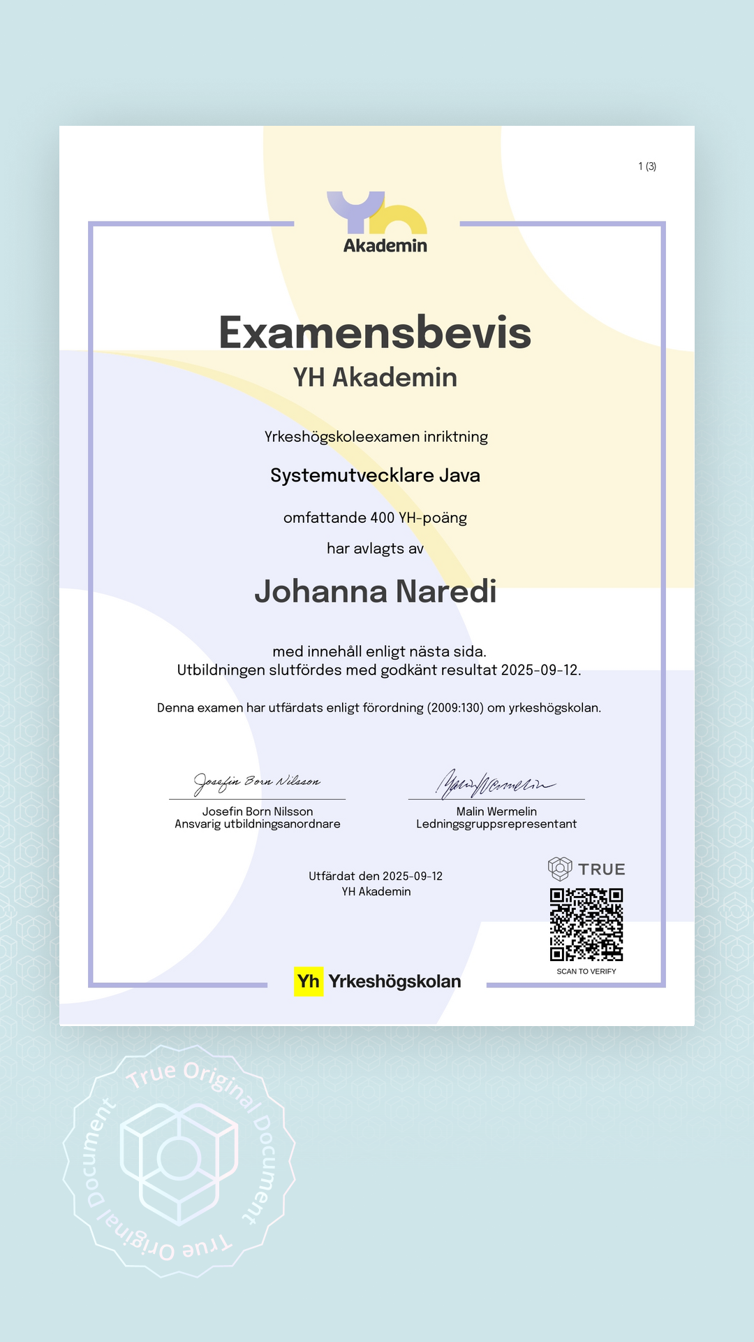 Alla TRUE -document är säkrade med blockchain-teknologi och kan verifieras som äkta. Klicka på verifieringsknappen bredvid dokumentet eller skanna QR-koden med din smartphones kamera. Ingen app krävs - dokumentets äkthet verifieras omedelbart.