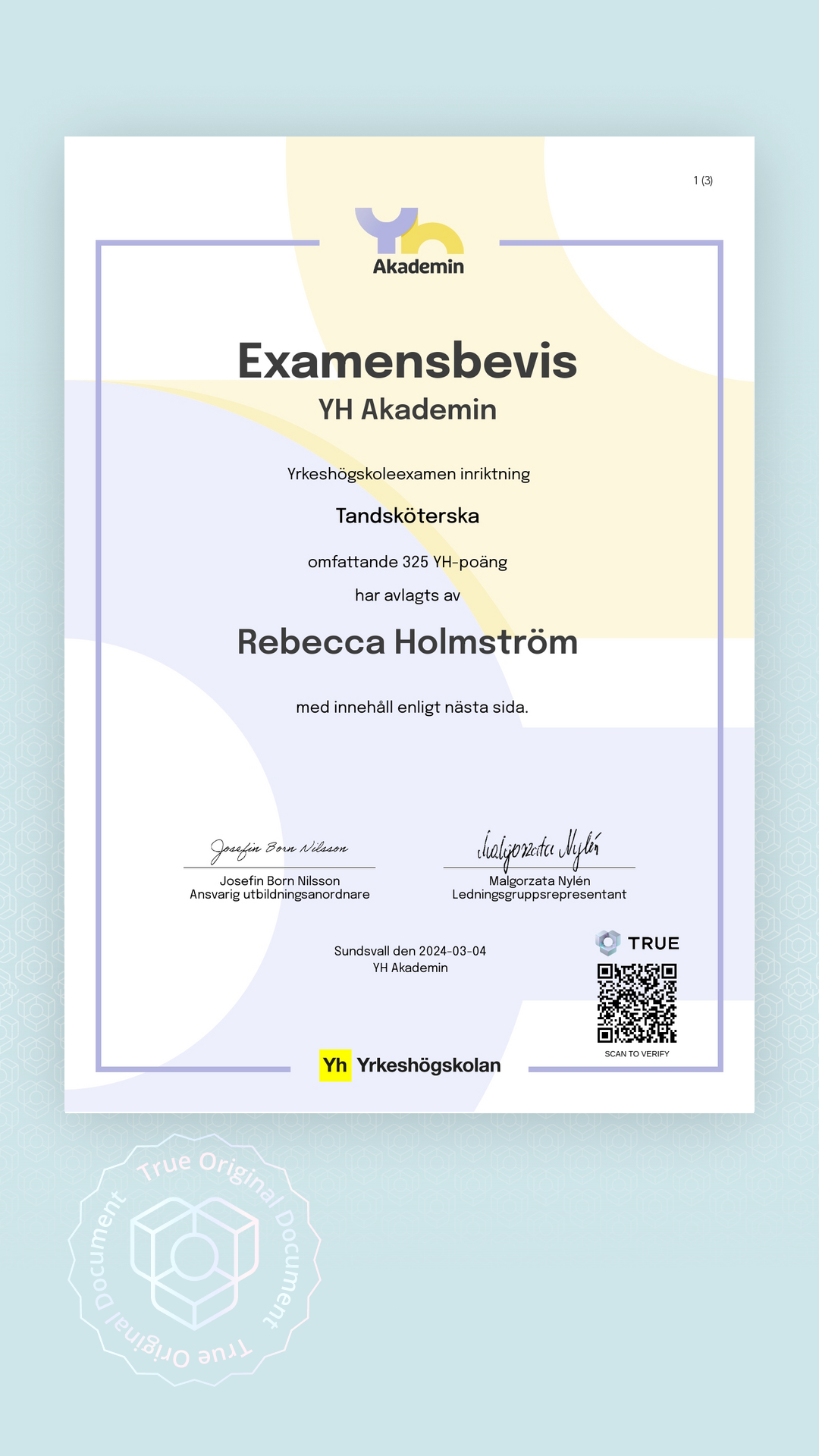 Alla TRUE -document är säkrade med blockchain-teknologi och kan verifieras som äkta. Klicka på verifieringsknappen bredvid dokumentet eller skanna QR-koden med din smartphones kamera. Ingen app krävs - dokumentets äkthet verifieras omedelbart.