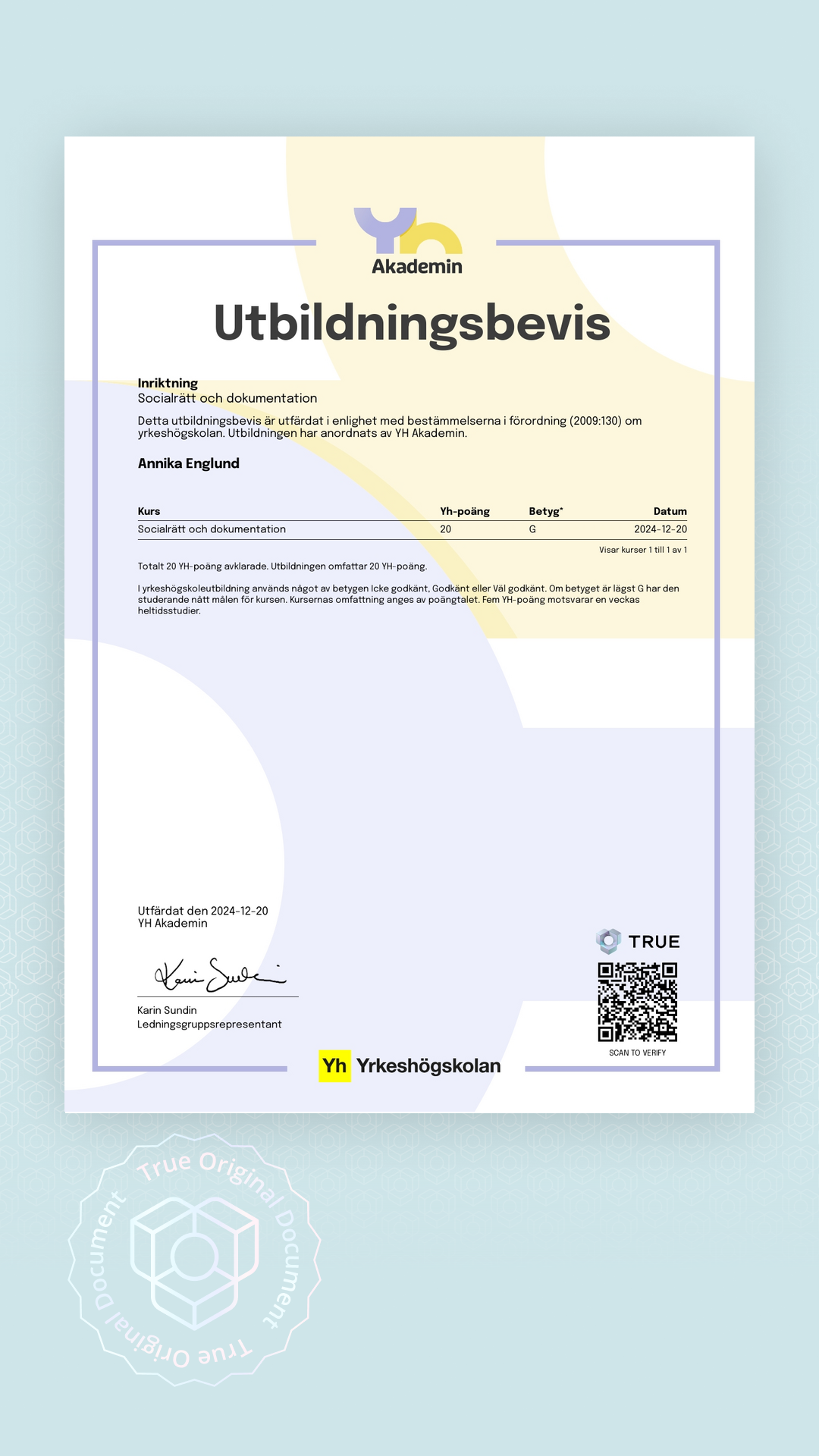 Alla TRUE -document är säkrade med blockchain-teknologi och kan verifieras som äkta. Klicka på verifieringsknappen bredvid dokumentet eller skanna QR-koden med din smartphones kamera. Ingen app krävs - dokumentets äkthet verifieras omedelbart.