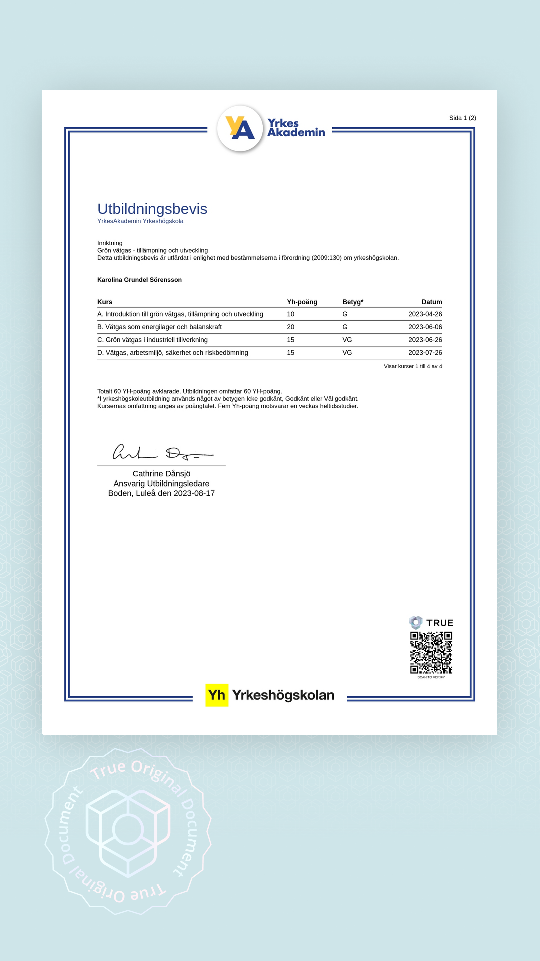 Alla TRUE -document är säkrade med blockchain-teknologi och kan verifieras som äkta. Klicka på verifieringsknappen bredvid dokumentet eller skanna QR-koden med din smartphones kamera. Ingen app krävs - dokumentets äkthet verifieras omedelbart.